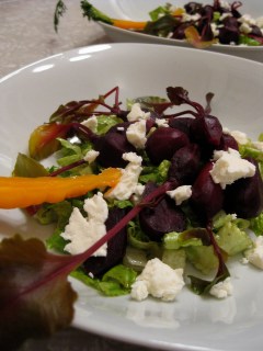 Some say that what grows together goes together. In this case it did! I cooked and cleaned the beets. Blanched the carrots and put them over a little romaine lettuce dressed with miso dressing. Sprinkled feta cheese over it, and it was great!