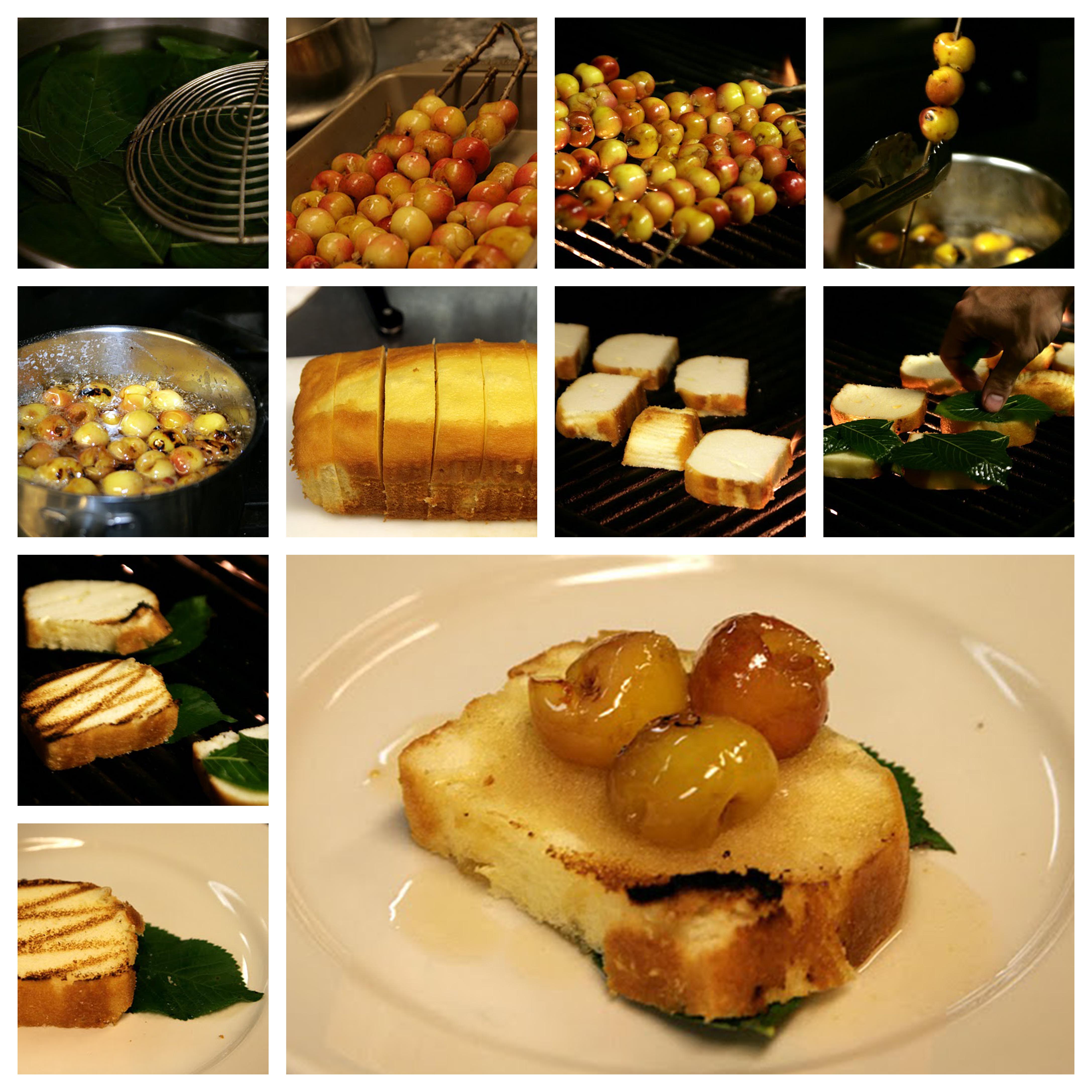 We all have seen the fruit and grilled pound cake desserts before, nothing new here. What was so great about this dessert is that I used all the elements of the cherry–not just the cherries, but the branches of the tree and leaves were used in the making of this dish.