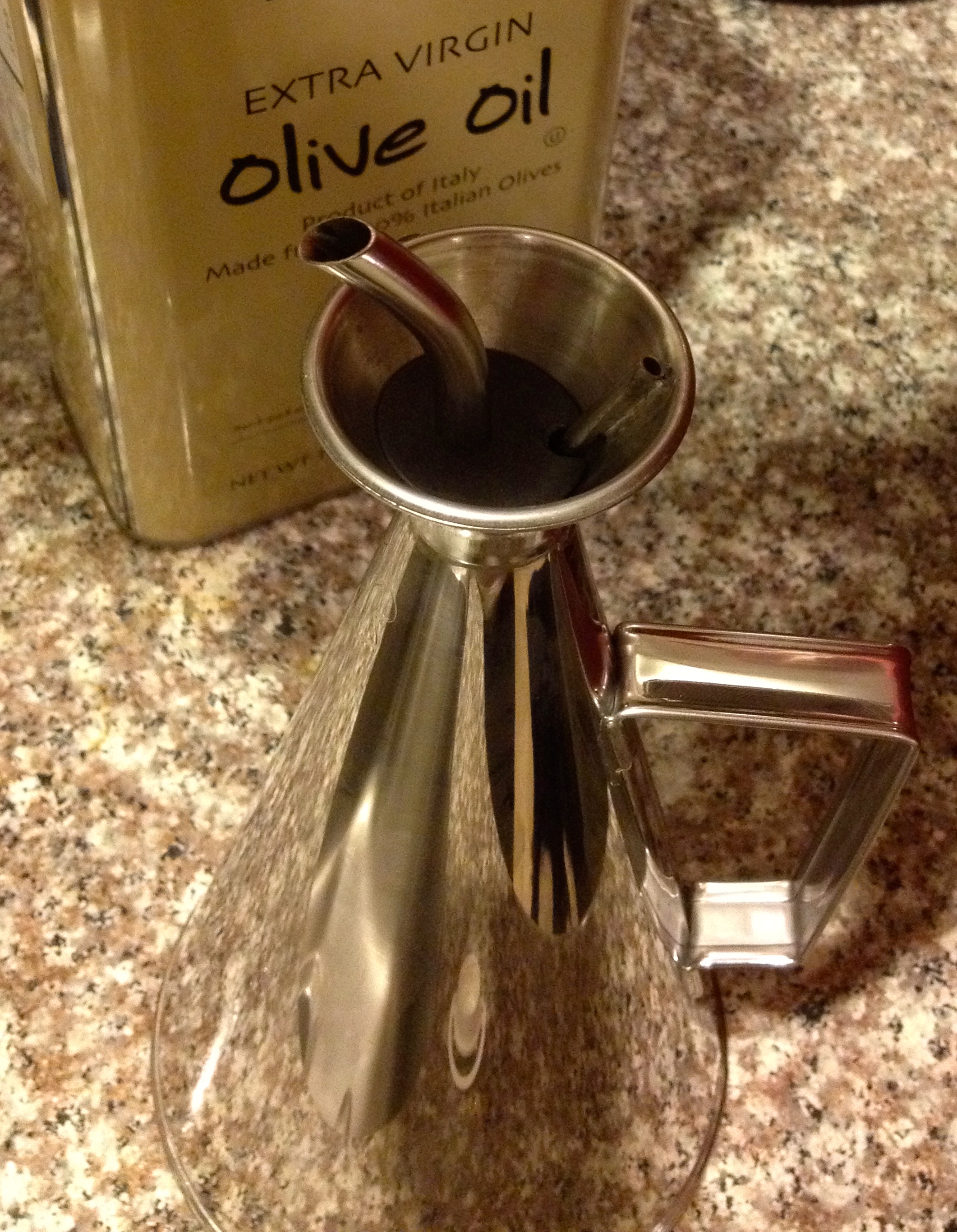 Olive oil is always present in my kitchen. This liquid gold is part of my heritage and I couldn’t do without. But at times it can be messy and that I could do without. Most oil dispensers are messy. The glass ones are pretty, but they never look clean and can get slippery with oil. The metal dispensers aren’t as fragile, but they typically drip and get oily. And those classic cans with the elongated spouts, they look pretty but the spout can get in your way–even break. As you see I am a bit finicky about my olive oil dispensers, but I think it’s worth being picky because it’s something we use every day.