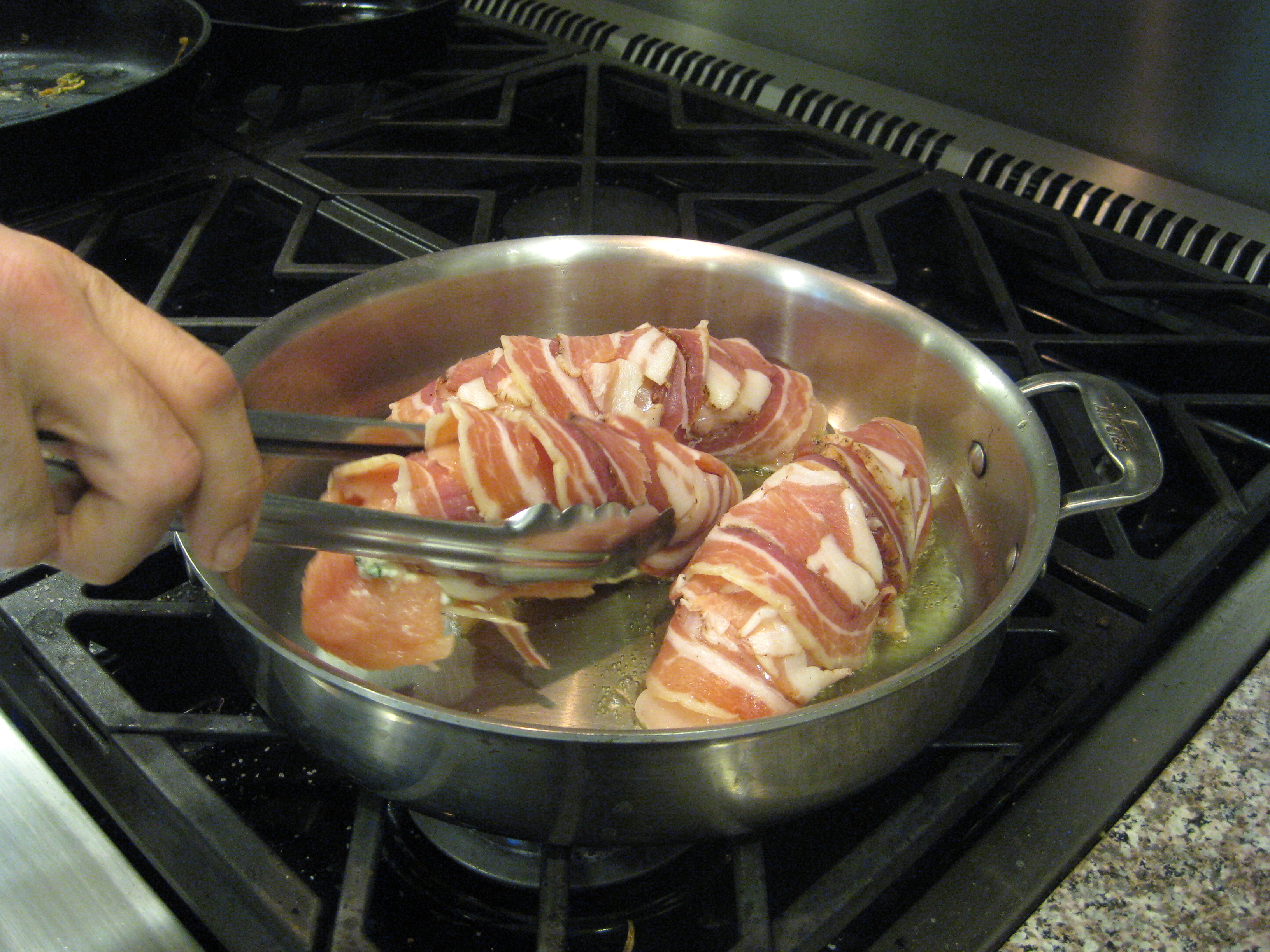 Last week I got a little fancy: I pounded the chicken breasts flat, stuffed them with goat cheese and fresh herbs from the garden, wrapped them in pancetta from Parma Sausage in the Strip, and cooked them up on the stovetop. It was good. My only complaint is that the pancetta is a little too salty. It has a great flavor overall, but next time I use it I might soak it first.