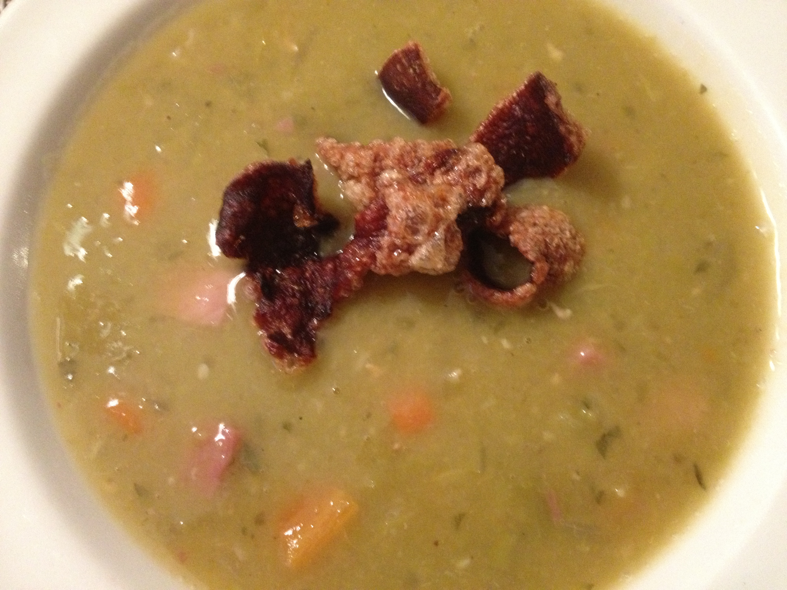 So, I thought–how about some smoky pork rinds as a garnish for the split pea soup I was working on?
