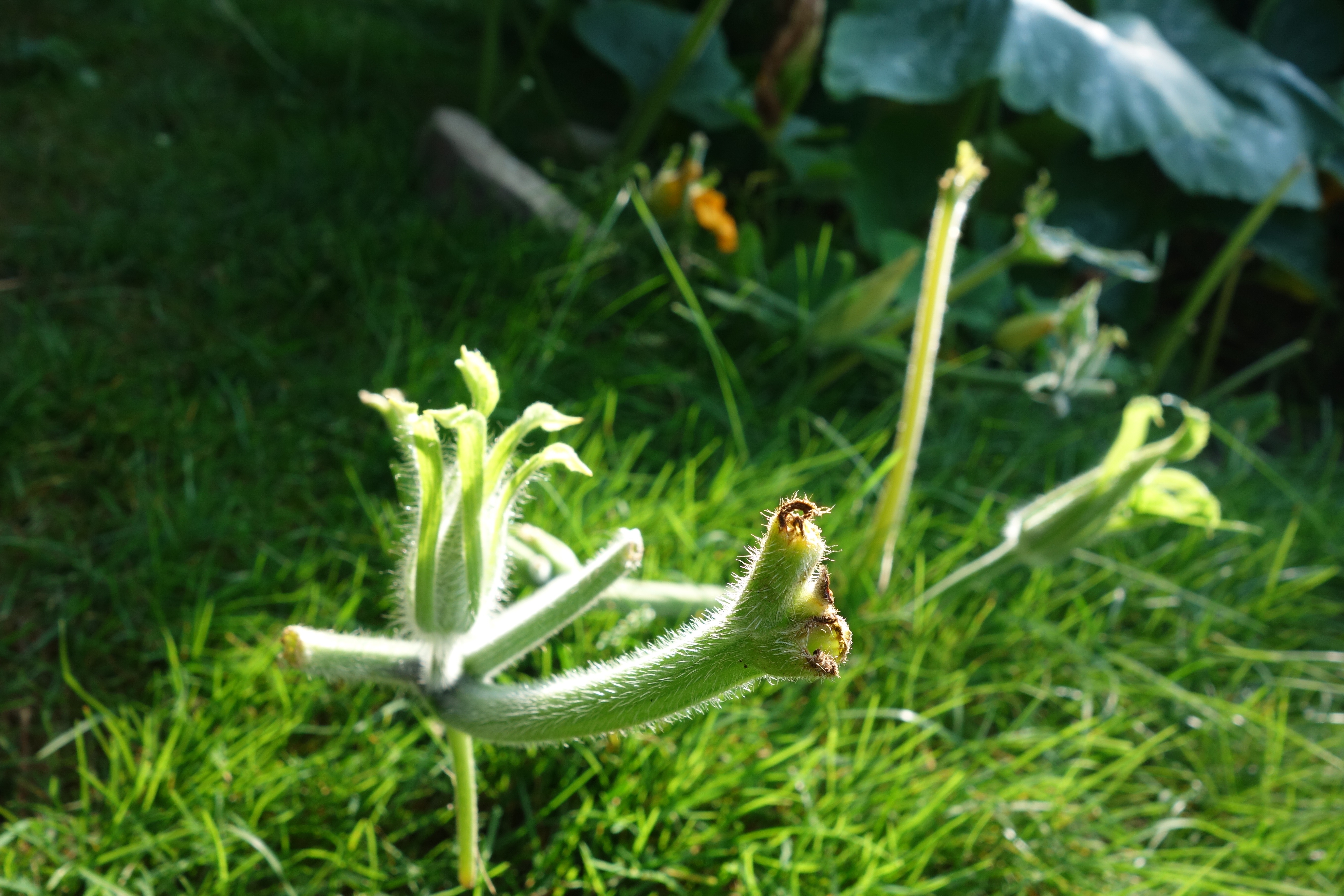 The deer nibble off all the tender leaf buds on the pumpkin vine. They haven’t eaten up all the blossoms–yet.