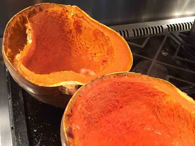 Since the autumn, I’ve had three big pumpkins decorating the bench in my foyer. I grew them in my garden last summer from seeds that Jo LaRocca collected on one of her food and gardening adventure trips to Mexico. Today I decided to cut one open to make pumpkin soufflé.