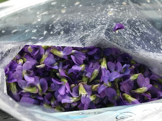 The fresher your violet harvest, the better, of course, but if you can’t gather 2-3 cups of violet flowers all at once, not to worry–they seem to keep just fine in the refrigerator.