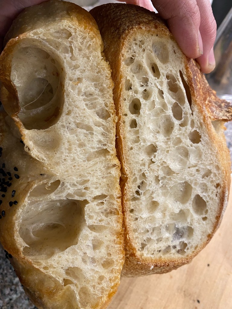 One experiment that has become a favorite is an olive oil bread made in a cast iron pan. For this, I coat the fermentation container with extra olive oil. The cast iron pan heats up in a 450° F oven for at least 30 minutes. Then I drizzle more olive oil over the dough. This is not just for flavor and texture–it also makes it easier to get the dough out of the container and onto the cast-iron with one hand without sticking.