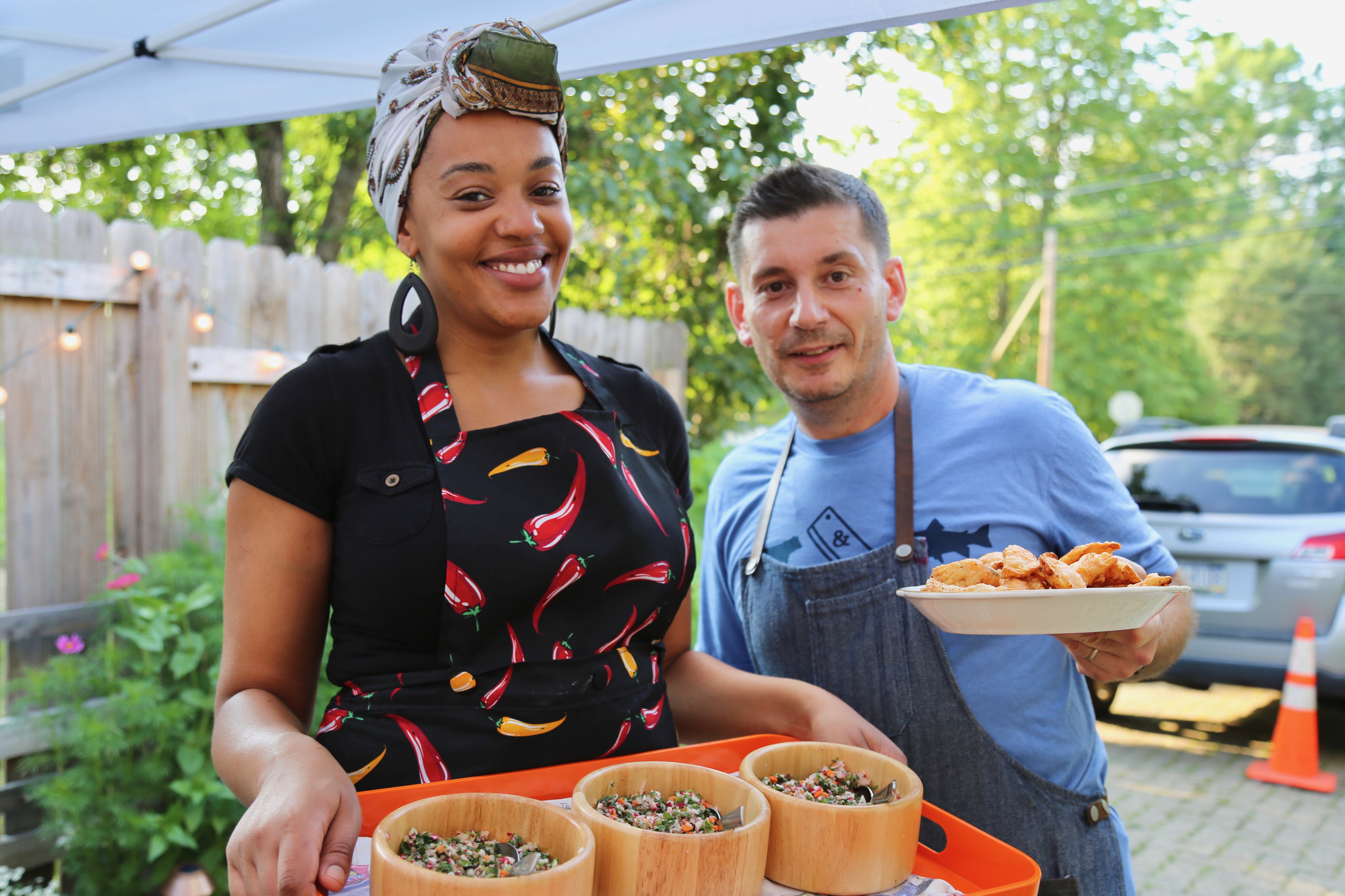 Keyla Nogueira Cook carrying bowls of radish salada and Daniel Agüera carrying a vegetarian appetizer